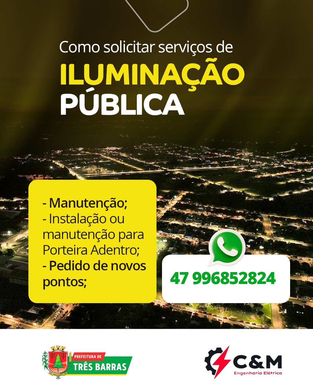 Você sabia que pode fazer os pedidos de melhorias ou reparos na iluminação pública pelo WhatsApp? Registrar sua solicitação é rápido e fácil. Basta enviar uma mensagem para o número 99682 0795 e a equipe da C&M Engenharia Elétrica, que presta esses serviços para o município de Três Barras, já cadastra o seu pedido. Em caso de dúvidas, entre em contato com a Secretaria de Planejamento para obter mais informações.
