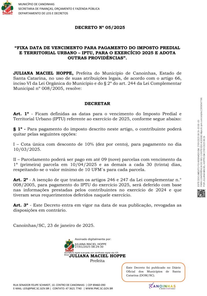 A prefeita de Canoinhas, Juliana Maciel Hoppe (PL), publicou o Decreto Municipal nº 05/2025, que fixa as datas de pagamento do Imposto sobre a Propriedade Predial e Territorial Urbana (IPTU) referente ao exercício financeiro de 2025. O decreto está disponível no Diário Oficial dos Municípios (DOM), na edição de segunda-feira, 27.