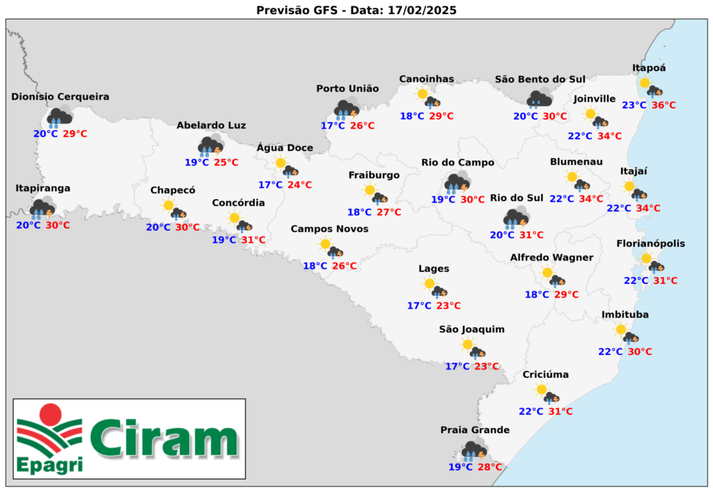 Ainda de acordo com a previsão do Ciram/Epagri, entre os dias 19 e 28 de fevereiro, será um período com dias de sol, variação de nuvens e calor em SC, mas com pancadas de chuva frequente, por vezes associadas a temporais isolados, devido ao calor e áreas de baixa pressão.