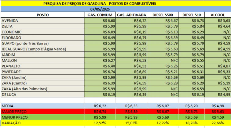 De acordo com os dados apurados, o preço mais alto encontrado para a gasolina comum foi de R$ 6,74, enquanto o menor valor registrado foi de R$ 5,99. “Essa diferença expressiva reforça a importância da pesquisa de preços por parte dos consumidores”, salienta o coordenador do Procon, Roberto Caetano.