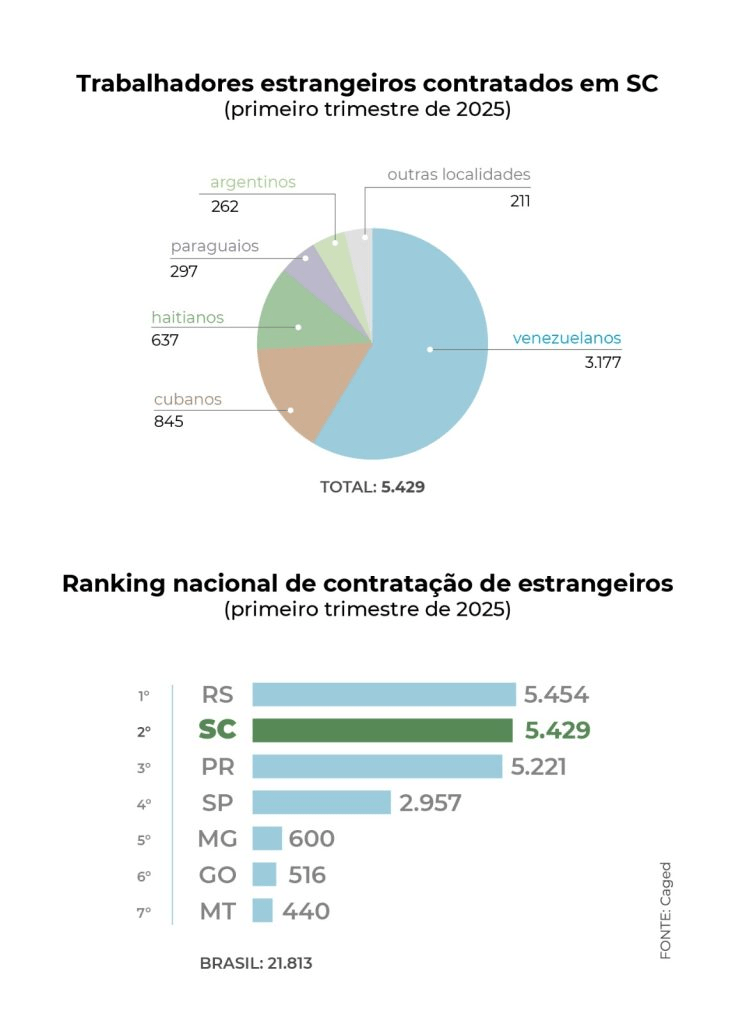 Santa Catarina é o segundo estado que mais contratou estrangeiros durante o primeiro trimestre de 2025, conforme o Caged. O estado acumula saldo positivo de 5.429 contratações de trabalhadores de outras nacionalidades, o que representa cerca de 25% dos 21,8 mil estrangeiros contratados em todo o país no mesmo período. Ou seja, a cada quatro estrangeiros contratados no Brasil em 2025, um trabalha em Santa Catarina. O estado ficou à frente de Paraná (5.221) e São Paulo (2.957) e atrás do Rio Grande do Sul (saldo de 5.454).