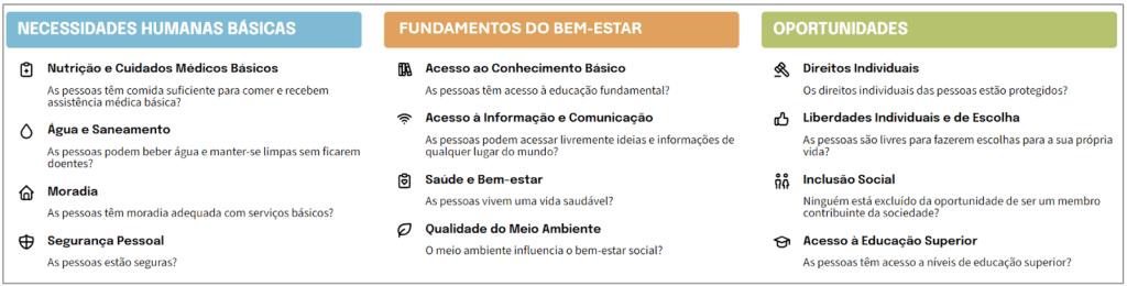 O índice analisa o desempenho social e ambiental de territórios, considerando 57 indicadores de órgãos oficiais e de institutos de pesquisa. Ele é feito em três dimensões: Necessidades Humanas Básicas, Fundamentos do Bem-estar e Oportunidades, que englobam 12 componentes como alimentação, moradia, saneamento, segurança pessoal, acesso à educação e qualidade do meio ambiente. Esta é a segunda edição do índice.