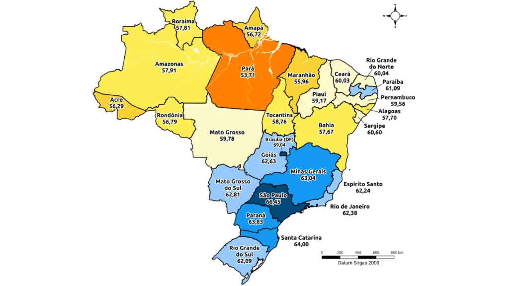 Santa Catarina ficou em terceiro lugar no ranking dos Estados. O estudo destaca que os melhores resultados nas dimensões Necessidades Humanas Básicas e Fundamentos do Bem-estar estão concentrados nas regiões Sul, Sudeste e parte do Centro-Oeste, o que inclui Santa Catarina. Além disso, os componentes com maiores pontuações médias — como moradia e saneamento — também apresentam seus melhores desempenhos nas regiões Sul e Sudeste.