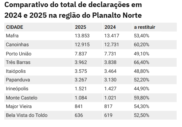 Na comarca de Canoinhas, foram 18.354 declarações enviadas pelos contribuintes dos municípios de Canoinhas, Três Barras, Major Vieira, Bela Vista do Toldo, em 2025. No ano anterior, em 2024, haviam sido 18.005 declarações enviadas pelos contribuintes da comarca. As maiores porcentagens de contribuintes que têm valores a restituir em toda a região do Planalto Norte se encontram nos municípios de Três Barras e Canoinhas.