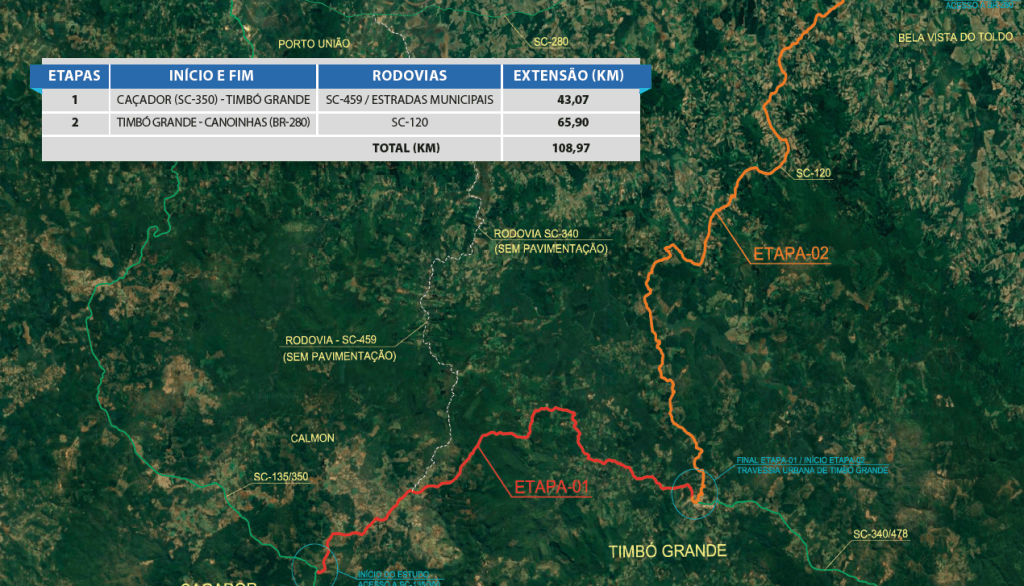 Um pré-projeto foi apresentado na reunião. A ideia compreende uma primeira etapa, que iria de Caçador a Timbó Grande. Depois, a segunda etapa iria de Timbó Grande a Canoinhas, aproveitando o traçado da SC-120, rodovia que é um verdadeiro tormento para quem dela depende dada sua precariedade. São 43 quilômetros de Caçador a Timbó Grande e 65,9 quilômetros da SC 120, totalizando 108,9 quilômetros.