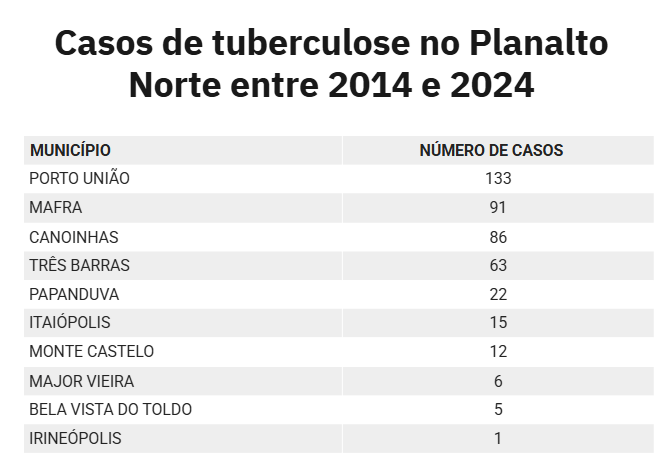 Dados apurados pela reportagem via Sinan, do DataSUS, apontam que entre os anos de 2014 e 2024, o Planalto Norte registrou 434 casos de tuberculose. Canoinhas está entre os três municípios com o maior número de casos registrados, sendo 86 notificações. O município com o maior número de casos na região durante é o período é o de Porto União, com 133 casos. Logo na sequência, em 2º lugar no ranking, o município de Mafra, com 91 casos registrados em 10 anos.