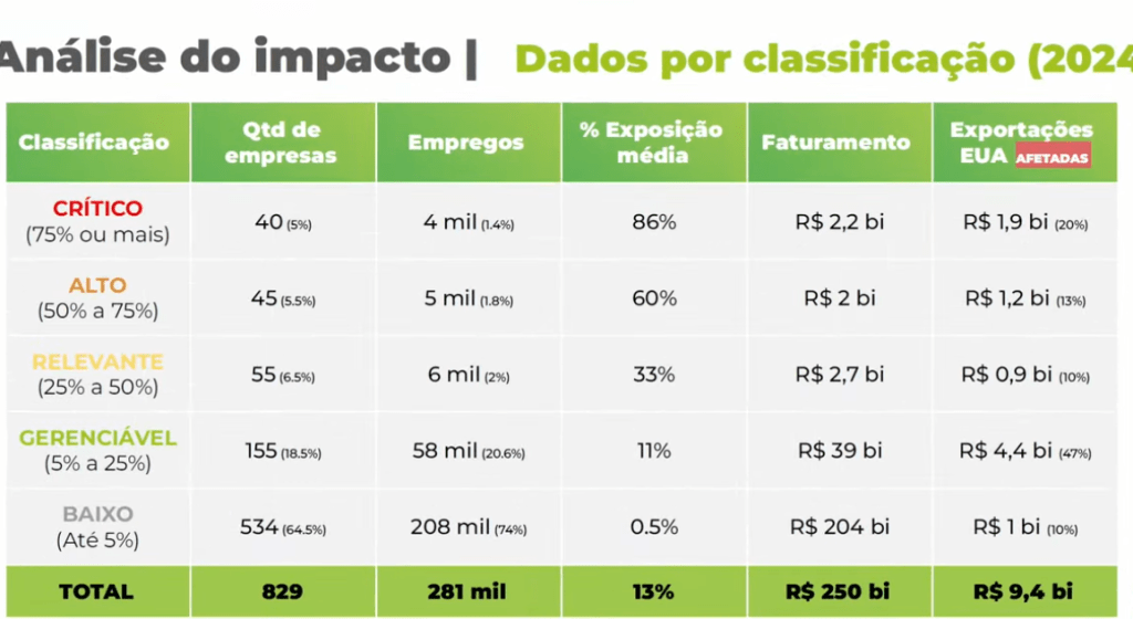 Em um universo de 829 empresas catarinenses afetadas, 40 enfrentam nível crítico. Essas 40 empresas empregam 4 mil pessoas e faturaram R$ 2,2 bilhões em 2024 (R$ 1,9 bilhão com os Estados Unidos).