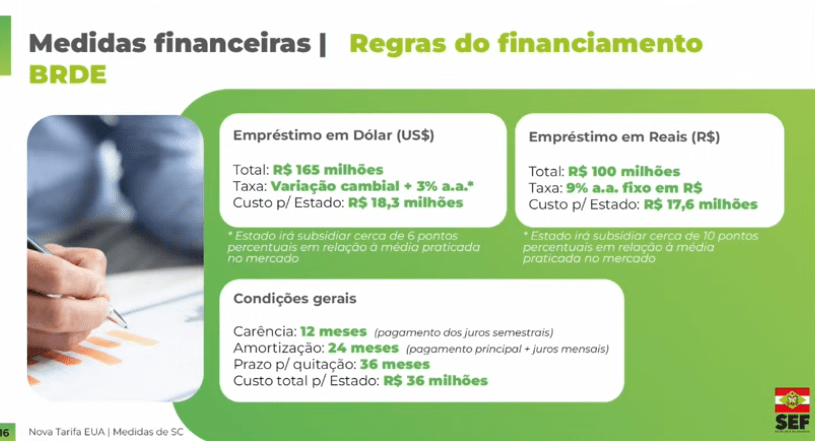 O Governo de Santa Catarina, em parceria com o BRDE, vai oferecer uma linha de financiamento emergencial, específica para cobrir, por quatro meses, os custos fixos das empresas (como energia, aluguel e folha de pagamento) na mesma proporção das receitas que vinham das exportações para os EUA. Será considerado o histórico de exportações para os EUA nos últimos 12 meses, não atrelado a exportações futuras.