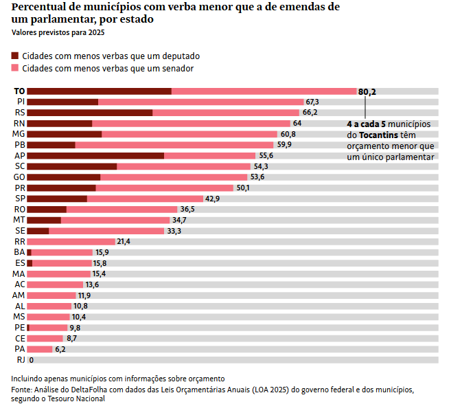 A reportagem mostra que cada um dos 81 senadores tem neste ano R$ 68,5 milhões para indicar onde o Governo Federal deve gastar (valor superior ao de 44% das cidades brasileiras, incluindo as quatro Planalto Norte). A Folha mostra ainda que cada um dos 513 deputados federais tem verba de ao menos R$ 37,1 milhões (valor acima de 712 cidades). A execução dessas verbas pelo Executivo é obrigatória, e ao menos metade precisa ir para a saúde.