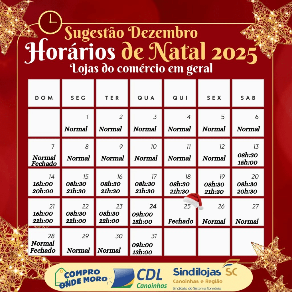 Nas vésperas de Natal e Ano Novo, muda o atendimento, com o comércio aberto até às 15 horas no dia 24 e até às 13 horas no dia 31. Nos dias 25 de dezembro e 1º de janeiro de 2026 todo o comércio estará fechado.